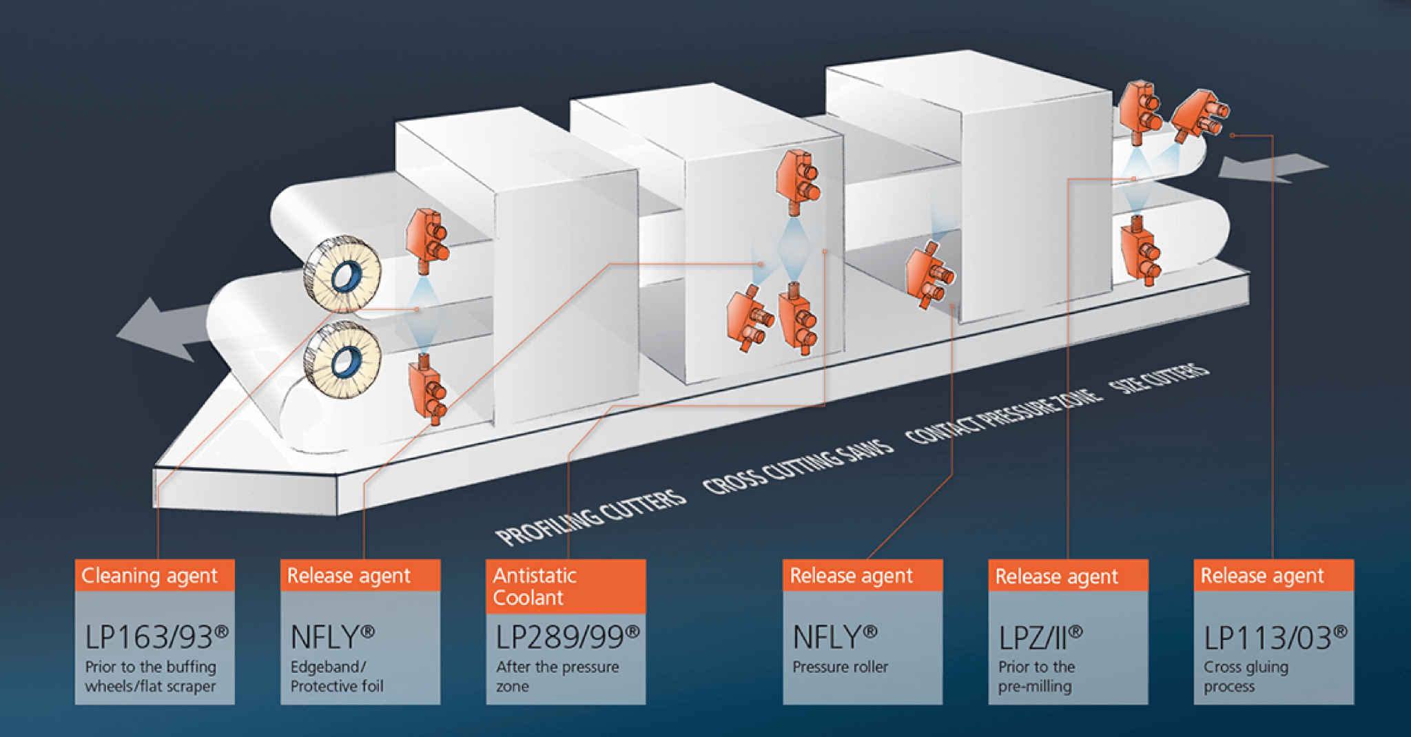 The Riepe® product range includes release agents, cleaning agents, and antistatic agents, each tailored for specific applications. These fluids are specifically designed to enhance the performance of renowned timber processing machines such as Homag, Biesse, Holz-Her, and Hebrock.