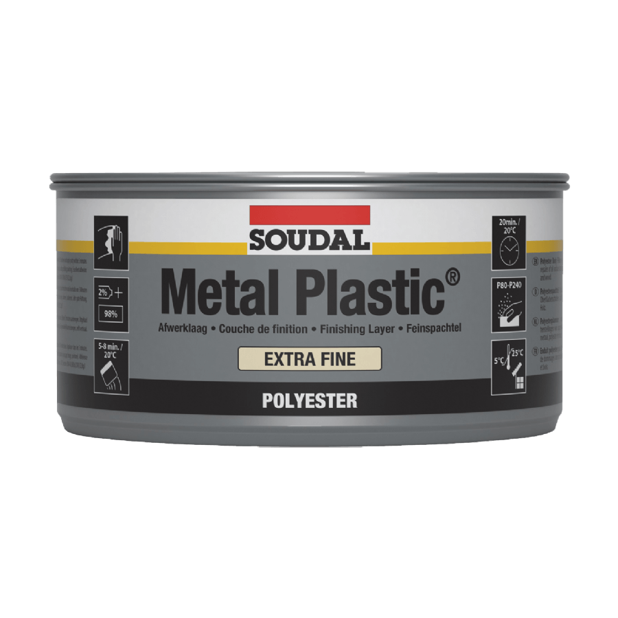 Soudal Metal Plastic is an extra fine, high quality two component polyester based body filler for the finishing of damaged surfaces prior to painting. The extra fine formulation is very easy to sand and smoothen.